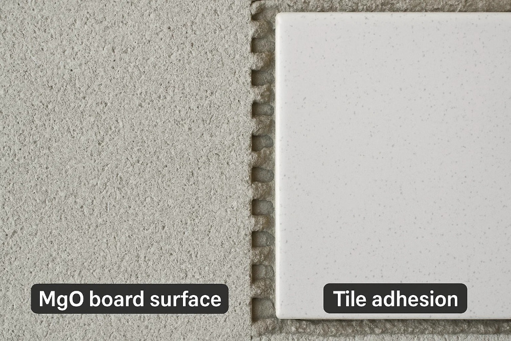 Obě desky poskytují vynikající povrchy pro adhezi dlaždic. Klíčový rozdíl spočívá v metodě. Porézní povaha cementové desky umožňuje, aby se malta z tenkého nastavení mechanicky spojila, když léčí na povrch. Někteří výrobci doporučují napínání povrchu, aby se snížila absorpčnost a zabránilo tomu, aby se tenké vysušení příliš rychle vyschlo, což může oslabit vazbu. Hladký, hustý povrch desky MGO poskytuje výkonnou chemickou vazbu s tenkým nastavením, což zajišťuje, že dlaždice přidržují bezpečně a vydrží roky.