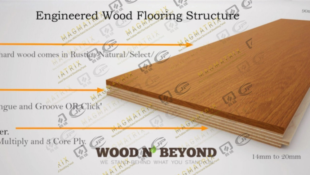 Více vrstev spojených dohromady ve vzoru křížových zrn tvoří inženýrské dřevo, což zlepšuje rozměrovou stabilitu. Struktura má pravou horní vrstvu dřevěné dýhy (tloušťka 2-5 mm) spojenou s několika vrstvami překližky. Tato jedinečná konstrukce vytváří produkt silnější a tužší než masivní dřevo. Většina produktů přichází s okraji jazyka a drážky. Mnoho výrobců nyní používá systémy kliknutí na blokování k usnadnění instalace.